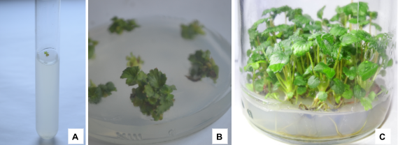 Plântulas alongadas e enraizadas (C).