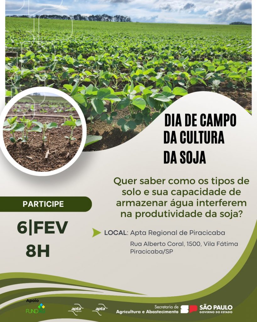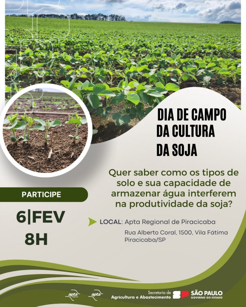 Em um cenário de estiagens cada vez mais intensas e frequentes, o solo assume papel estratégico na sustentabilidade da cultura da soja. Para aprofundar esse debate, a Apta Regional de Piracicaba, vinculada à Secretaria de Agricultura e Abastecimento do Estado de São Paulo, realiza o Dia de Campo da Cultura da Soja, voltado a produtores, pesquisadores e profissionais da cadeia produtiva. O evento técnico-científico ocorrerá no dia 6 de fevereiro, das 08h às 12h, na sede da instituição, localizada na Rua Alberto Coral, 1500 – Vila Fátima, Piracicaba/SP.