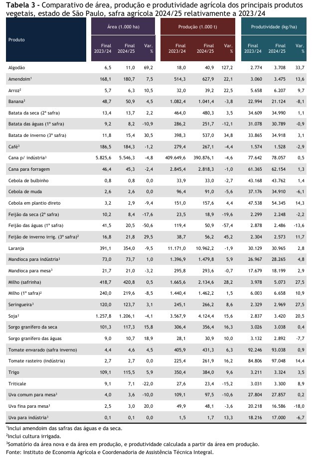 Levantamento do Instituto de Economia Agrícola traz projeções para próxima safra e também fechamento do ciclo 24/25
