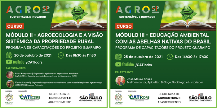Já o terceiro módulo “Educação Ambiental com as Abelhas Nativas do Brasil”, contará com palestra e bate-papo com o meliponicultor, apicultor, biólogo, sociólogo e historiador, José Mauro de Souza, mais conhecido no meio onde atua como professor Maurinho. Essas palestras fazem parte da programação de capacitações do Projeto Guaraipo, uma realização em parceria entre a Comissão Interinstitucional de Educação Ambiental (Ciea-SP) e a CATI/CDRS.