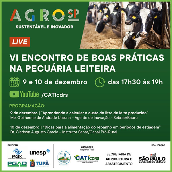 Por esse motivo, os extensionistas da Coordenadoria de Desenvolvimento Rural Sustentável (CATI/CDRS) estão sempre atentos em oferecer todo tipo de capacitação voltada à pecuária de leite. E não é diferente com a realização deste VI Encontro de Boas Práticas na Pecuária Leiteira, organizado pela CATI Regional Tupã em parceria com vários outros órgãos, entre eles a Universidade Estadual Paulista (Unesp/Bauru), Programa de Pós-Graduação em Agronegócio e Desenvolvimento (PGAD), Grupo de Pesquisa e Extensão Kamby, Prefeitura Municipal de Tupã. O Encontro acontece anualmente, porém em 2020 e este ano estão sendo realizados de forma virtual devido à pandemia.