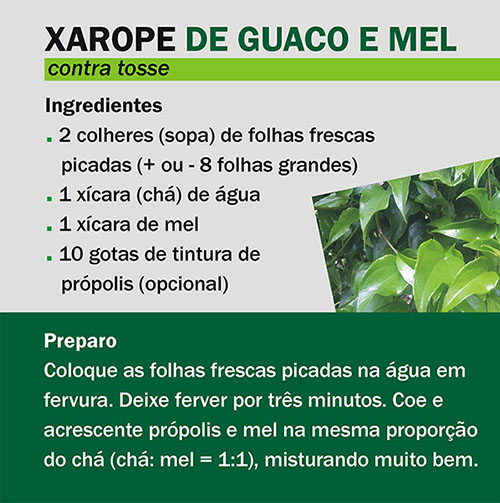 Segundo Maria Cláudia, no bioma brasileiro da Mata Atlântica ocorrem duas espécies de guaco, cujas propriedades medicinais são comprovadas e, por isso, foram incluídas na Farmacopeia Brasileira. Ambas possuem ação broncodilatadora, indicadas como expectorantes e têm a cumarina como princípio ativo principal. Para elaboração de chás e xaropes caseiros, o guaco pode ser utilizado fresco ou seco.