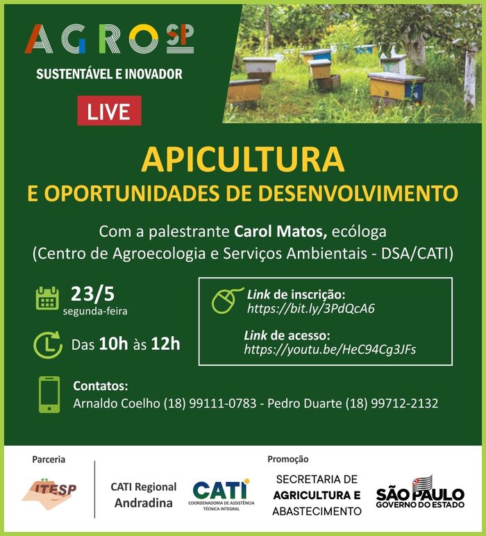 “Nessa live falaremos sobre as oportunidades de desenvolvimento da Apicultura no Estado de São Paulo, levando um pouco do conhecimento que os extensionistas do Grupo Técnico de Apicultura e Meliponicultura têm construído e compartilhado, abordando desde os aspectos da regularização da atividade quanto os nichos de mercado que podem ser aproveitados pelos produtores.”, explica Carolina, que será a palestrante do evento. “Atualmente, existem cerca de 60 técnicos extensionistas da CATI que se dedicam ao apoio a apicultores e meliponicultores, contribuindo para o fortalecimento dessas cadeias produtivas”, complementa.