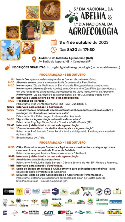 Nesse contexto, a CATI realiza a 5.ª edição do Dia Nacional da Abelha e o 1.° Dia da Agroecologia, que estão chegando com uma programação abrangente e diversificada. Durante os dois dias de evento, o público poderá acompanhar palestras e participar de oficinas, visita técnica e uma grande feira de produtos apícolas e da Agroecologia, bem como de sementes crioulas, artesanato, culinária com plantas alimentícias não convencionais (PANC) e plantas medicinais. Além disso, a programação contará com a presença de representantes dos povos tradicionais, indígenas e quilombolas, apresentando e comercializando sua culinária típica e artesanatos.