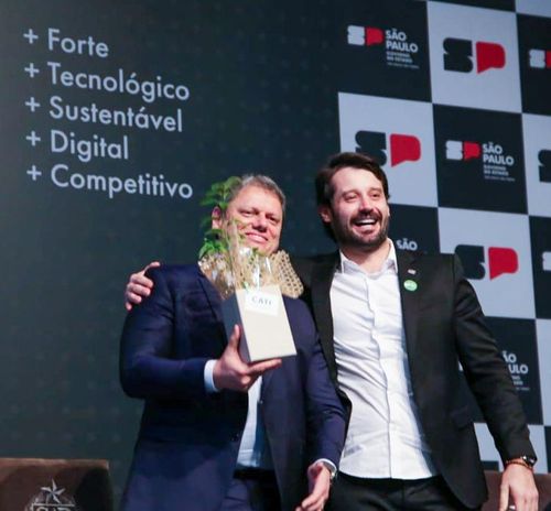 O secretário de Agricultura, Guilherme Piai, entrega ao governador, Tarcísio de Freitas, muda de jequitibá-rosa produzida pela CATI Sementes e Mudas, simbolizando as ações sustentáveis em prol do agro Paulista.