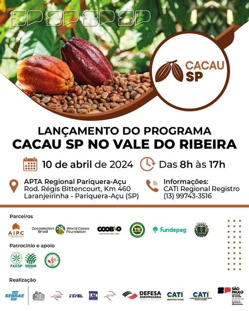 No próximo dia 10/4, a Secretaria de Agricultura e Abastecimento, por meio da Coordenadoria de Assistência Técnica Integral (CATI) e da Agência Paulista de Tecnologia dos Agronegócios (APTA), lança o Programa Cacau SP no Vale do Ribeira, em uma ação coordenada com parceiros da pesquisa, de entidades ligadas ao segmento da cacauicultura e da iniciativa privada. A abertura contará com a presença do secretário executivo de Agricultura e Abastecimento, Edson Fernandes, e de autoridades municipais e regionais.