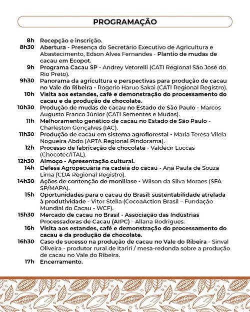 “O nosso objetivo, ao optar por uma programação técnica para o lançamento do Programa Cacau SP no Vale do Ribeira, é apresentá-lo aos interessados contextualizando a cacauicultura na região, demonstrando o que há de mais recente em sistemas de consórcio, desde aspectos ligados à produção de campo, produção de mudas, até a análise de mercado”, explica Marcos Augusto Franco Júnior, diretor do Centro de Mudas da CATI Sementes e Mudas, que integra a comissão organizadora do evento.