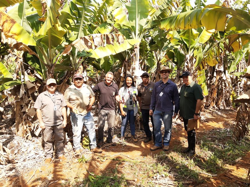 Da direita para esquerda: Alberto (Defesa Agropecuária); Luiz Carlos (bananicultor de Itaberá); Wilson (pesquisador do SFA-SP/MAPA); Simônica Maria de Oliveira (Defesa Agropecuária de Itapeva); Valber (MAPA), Rafael Peressuti (CATI Regional Itapeva); Altair (SFA-SP/MAPA).