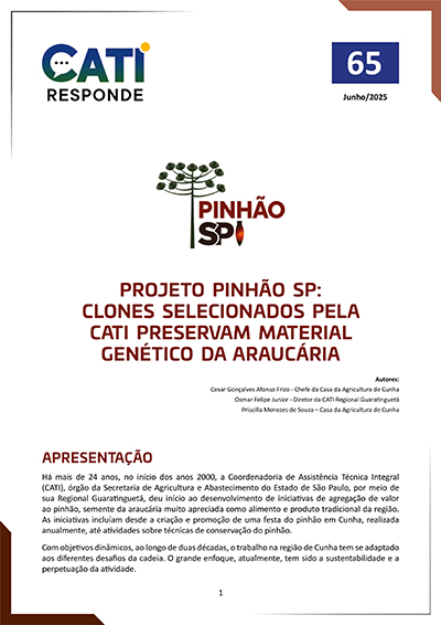 O informativo técnico “CATI Responde 65: Pinhão SP”, produzido e editado pela CATI, será lançado durante a Hortitec, no dia 25 de junho, e estará disponível no site cati.sp.gov.br a partir desta data.