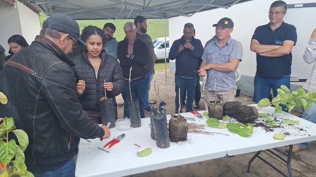 Marcos Augusto Franco Júnior, chefe da Divisão de Mudas, da CATI Sementes e Mudas, destacou a necessidade de garantir qualidade na produção de mudas, enquanto Tadeu Donizeti da Veiga, chefe de operações de campo do Núcleo de Mudas de Itaberá, da CATI Sementes e Mudas, realizou demonstrações práticas de diferentes técnicas de enxertia.